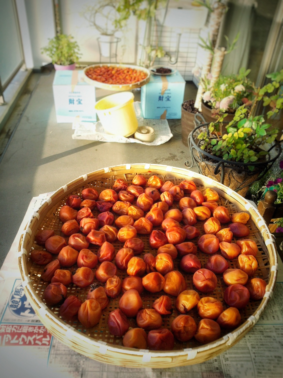 昔はどこの家でも梅干しを、梅雨の開けたこの時期に干していました。 最近は、はちみつ味の梅干しが多く出ていますが、昔ながらの酸っぱーい梅干し!が懐かしく友人に伝授してもらい漬けてみました。 11月ごろには美味しくなっているはずーーー。